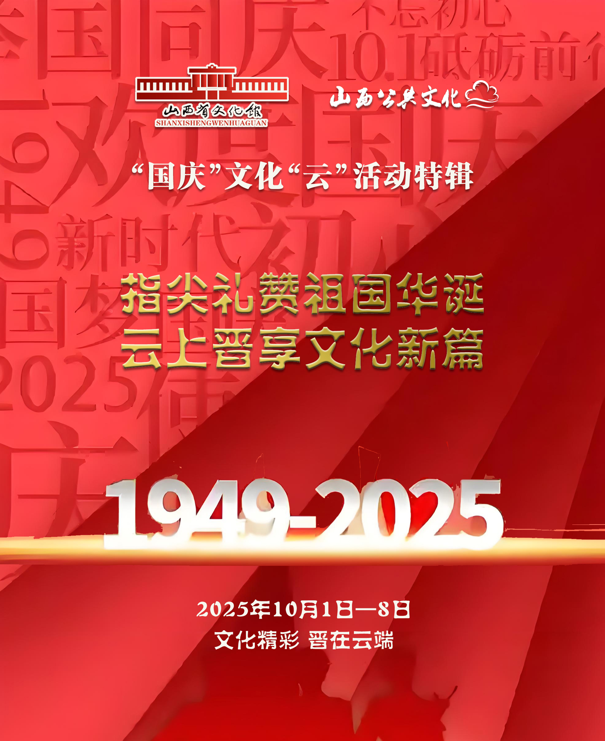 同庆祖国华诞,礼赞奋进新时代!2025年“国庆”“中秋”喜相逢,超级黄金周即将来临,山西省文化馆·山西公共文化云线上文化活动精彩纷呈,邀您共赏三晋文化魅力,共享文化美好生活!无论身处城市景区、商圈社区,还是乡村田野,打开手机,动动手指,山西省文化馆·山西公共文化云文艺大餐都将与您邂逅,多彩艺术盛宴扮靓您的假日生活。